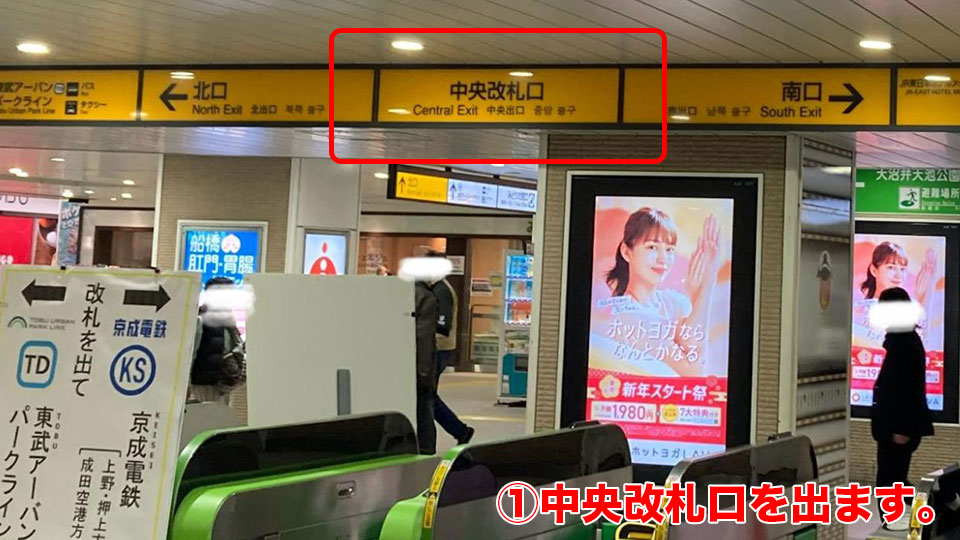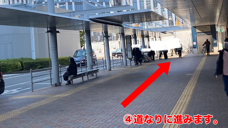 - 南口を出たらバスターミナルがありますので、右手に曲がって下さい。