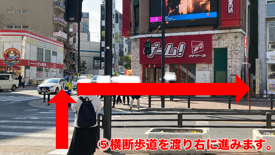 - そのまま通路に沿って歩いていただくと、アドアーズが見えてきますので、横断歩道を渡って右にお進みください。
