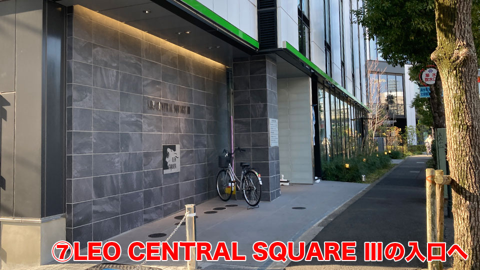 - 少し歩くと左手に「LEO CENTRAL SQUARE Ⅲ」というオフィスビルがあるので入口までお進み下さい。